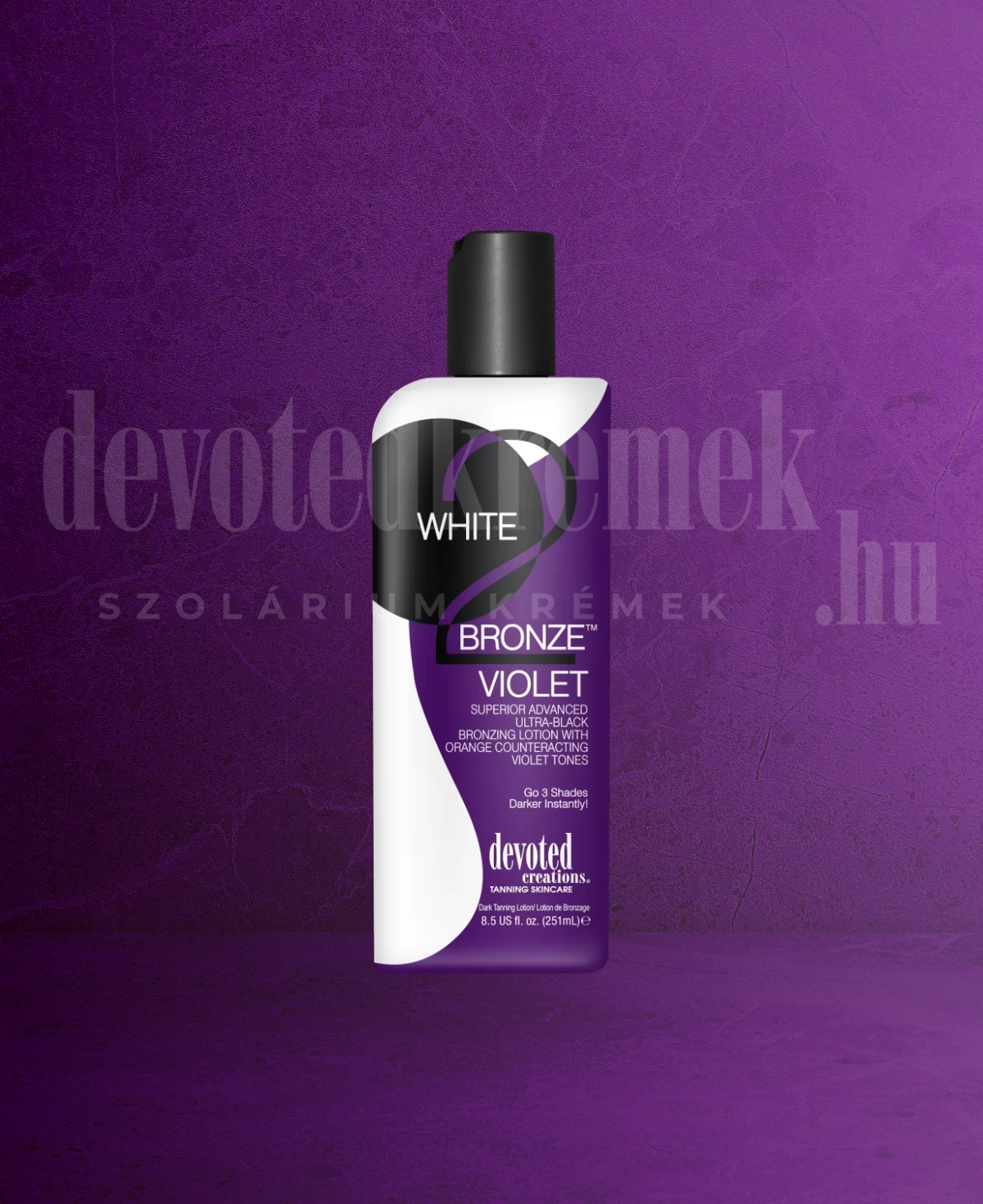 Tapasztald meg a barnulás új dimenzióját a White 2 Bronze Violet™ segítségével! Ez a magas DHA-tartalmú, természetes és lila tónusú bronzosító lotion már az első használat után akár 3 árnyalattal sötétebb bőrszínt eredményez – gyorsan, foltmentesen.